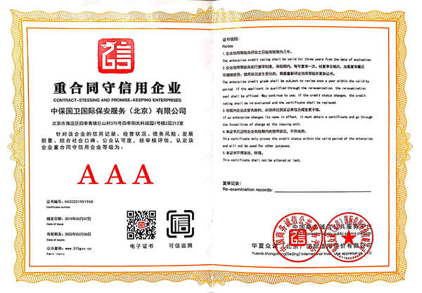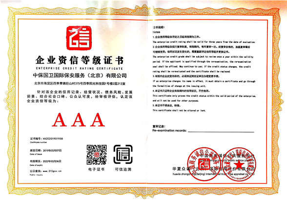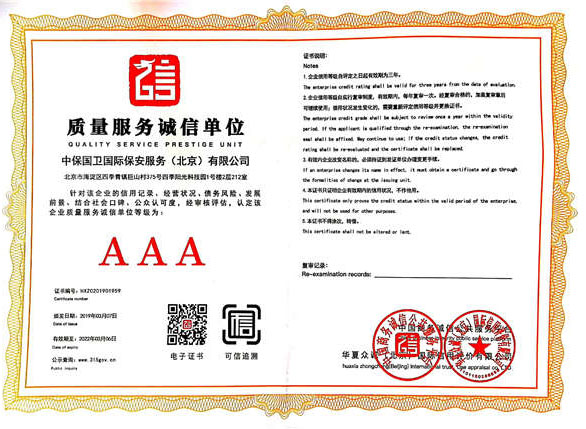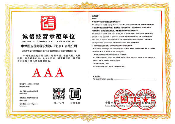 中保國衛(wèi)國際保安服務(北京)有限公司,屬中保國衛(wèi)集團旗下子公司。能全方位的為大型客戶提供優(yōu)質(zhì)的安保、押運服務,是集人防和技防于一體的新型正規(guī)化綜合安保押運服務企業(yè),提供人防、物防、技防、聯(lián)網(wǎng)報*、非武裝押運等安防相關的一站式服務。 公司在國內(nèi)多省設立有分公司及分支機構(gòu),著重提升安全押運、智能技術(shù)押運及安全技術(shù)防范相關的服務,業(yè)務范圍覆蓋全國一、二線城市、港澳地區(qū)以及海外地區(qū)。安保方面主要為政府機構(gòu)、金融機構(gòu)、企事業(yè)單位、醫(yī)療衛(wèi)生、高等院校、工業(yè)園區(qū)、大型商場、高檔住宅、智能商務樓、大型活動提供門衛(wèi)、守護、巡邏、押運(非武裝)、安全檢查、保安特勤、私人護衛(wèi)、消防中控、安全技術(shù)防范、遠洋護航等全方位服務,同時面向國際市場,為中資企業(yè)在“一帶一路”沿線國家投資提供境外安保服務。 >> 更多內(nèi)容 |